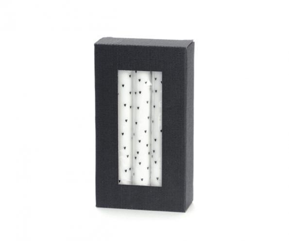 Op de kaars staat een leuke print met zwarte hartjes, de hartjes zijn eerst met de hand getekend en ontworpen door By Kimmi. Daarna worden ze heel precies op de kaars gedrukt. Door de powder press techniek krijgen deze kaarsen hun mooie matte uiterlijk en zijn ze ook nog eens fluweelzacht.
